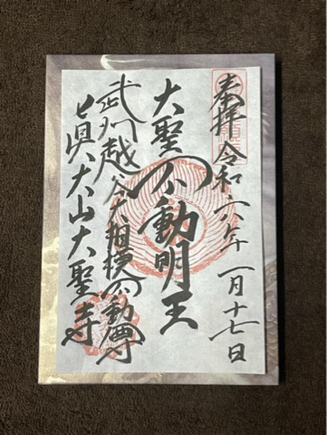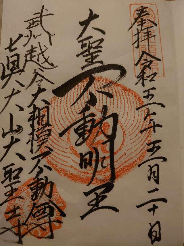 不動堂 緣起ノ略ニ 往古良辨僧正相州大山開闢ノ時 面ノアタリ 不動ノ靈容ヲ拜シ 其尊像ヲ刻マントテ 先其木ノ根本ヲモテ一刀三禮シ 一像ヲ彫刻シ 是ヲ大山根本不動ト名付ク 大聖寺開山ノ僧不動坊トイヘル者 夢ノ吿ニ任セ 彼像ヲ負出テ當所ニ來リケルカ 俄ニ笈重クナリケレハ 是コソ有緣ノ地ナラントテ 遂ニ當山ニ安置セリ ヨリテ山ヲ眞大ト號シ 地ヲ大相模ト稱シ 且其不動坊又不動院トイヒ 僧俗ノ尊崇斜ナラス 天正十八年東照宮御入國アリ 大聖寺ノ住侶定傳トイヘルモノ高德タルニヨリ御歸依淺カラス 同キ十九年寺領六十石ヲ賜ハリ 慶長五年下野小山御歸陣ノ砌當地ヘ御渡アリ 關ヶ原御陣ノ御願ヲ懸ラレ 御太刀ヲ納サセ賜ヒシカ 御利運ノ日ニ當リ著シキ靈驗アリケレハ 是ヨリ世ノ人彌崇敬シ 每年正五九月ニハ會式ヲ興行スト見エタリ 此餘サマサマノ事ヲ書綴レト妄誕ニ亘レハ取ラス 本尊良辨ノ作ハ一尺七寸許ノ立像ナル由 祕佛トシテ人ニ示サス 前ニ智證ノ刻メル一尺三寸ノ立像ヲ安セリ 仁王門 門外ニ寬保四年ノ制札ヲ立リ 二天門 持國毘沙門ノ二像ヲ安ス 裏門 眞大山ノ額ヲカヽク 經堂 鐘樓 明和三年鑄造ノ鐘ヲカク