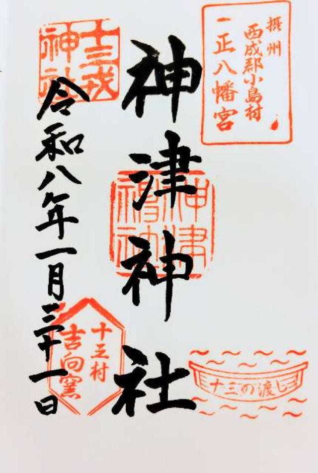 | 由来 | 神津神社は明治四十二年(一九〇九)、法令により数ヶ村の氏神合祀の実行に際し、旧神津村の内字三津屋を除き小島(現在の十三東)、木川(同木川、西宮原の一部、三国本町の一部)、野中(同野中)、新在家(同新高)、堀上(同三津屋南一、野中の一部)、今里(同十三元今里、田川の一部)、堀(同十三本町)、の七ヶ字協議の上、小島村の村社八幡神社を中央適当地と定め、各産土神社及び末社を此処に合祀したものです。そのとき西成郡の9つの神社が合祀されました。 |