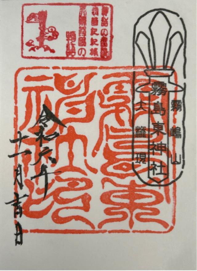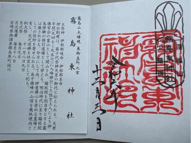 | 由来 | 伊邪那岐尊・伊邪那美尊を主祭神として祀り、第十代崇神天皇の代に霧島山を信仰の対象とする社として創建されたと伝わる。 天暦年間(947~957)に天台宗の僧、上空上人が神社のかたわらに別当寺である、錫杖院を建立し、霧島六社権現のひとつとして霧島山で神意仏心を崇める修行を行う修験者たちの拠点となった。当時は霧島山大権現東御在所之宮と呼ばれ、霧島修験の興隆に伴い社寺ともに栄えた。 度重なる霧島山の噴火により、復興造営を重ねており、現在の社殿は享保12年(1722)の造営により、幾度かの改修を経て今に至る。殿内奥には雌雄一対の龍柱が祀られ、正面には寛文6年(1666)薩摩藩主島津光久公寄進の「東霧島坐 [霧島の東に坐(いま)す]」の扁額が納められている。 |