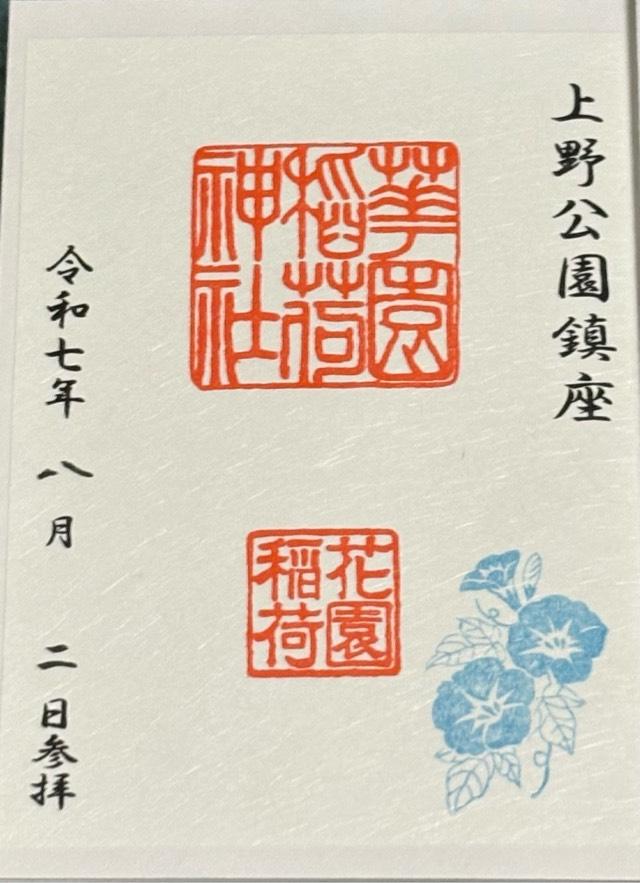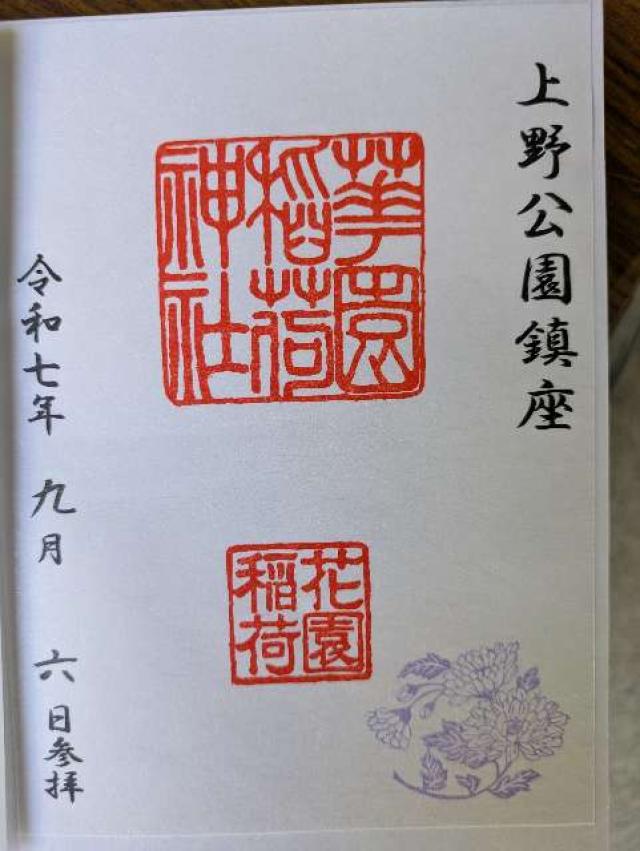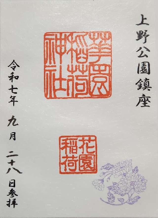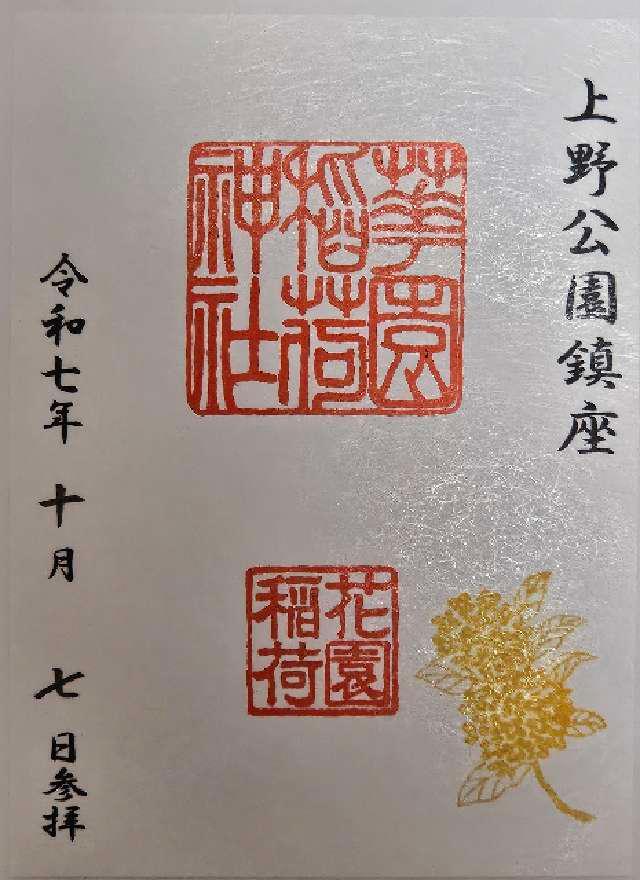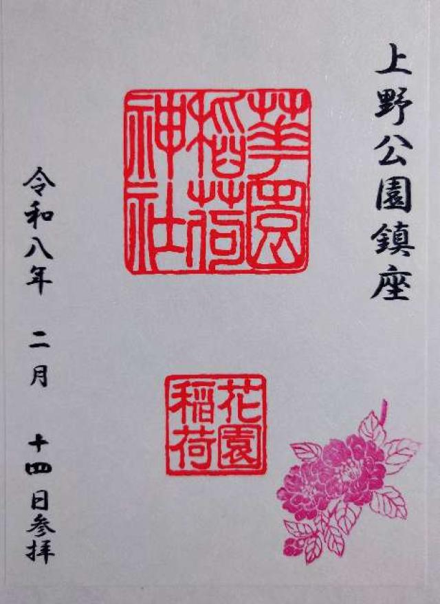承応3年(1654年)、天海大僧正の弟子、本覺院の住僧、晃海僧正が、霊夢に感じ廃絶していたお社を再建し上野の山の守護神としました。 幕末、彰義隊の戦では最後の激戦地(穴稲荷門の戦)としてしられています。 後、明治6年(1873年)に岩堀数馬、伊藤伊兵衛等の篤志家によって再興され、花園稲荷と改名、五條天神社が現地に御遷座になるに及び、社殿も南面して造営され神苑も一新されました。 |