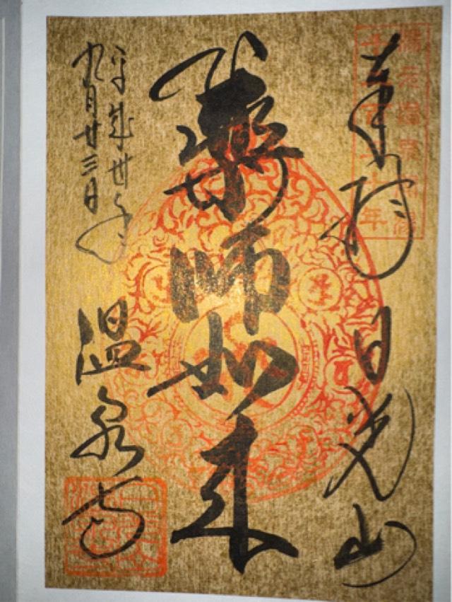16文字写経(薬師経十二の大願)を納経したお印となる金の特別御朱印を頂きました。