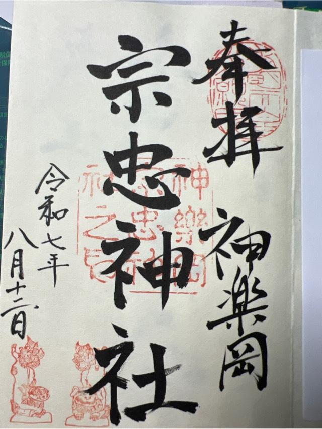 | 由来 | 黒住宗忠は嘉永3年(1850年)に歿し、安永3年(1856年)に朝廷から「宗忠大明神」の神号が与えられた。文久2年(1862年)、宗忠の門人の赤木忠春らが、吉田神社より社地の一部を譲り受けて宗忠を祀る神社を創建した。慶応元年(1865年)には朝廷の勅願所とされ、皇室や公家から篤い崇敬を受けた。明治時代には県社に列格した。 岡山の宗忠神社との区別のため、鎮座地名から「神楽岡宗忠神社」とも呼ばれる。 |