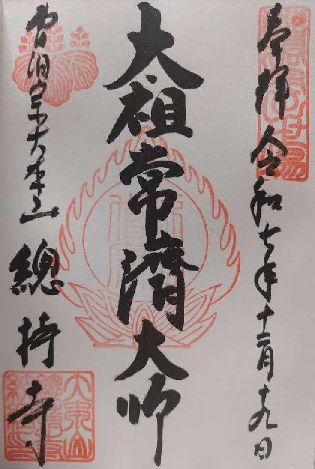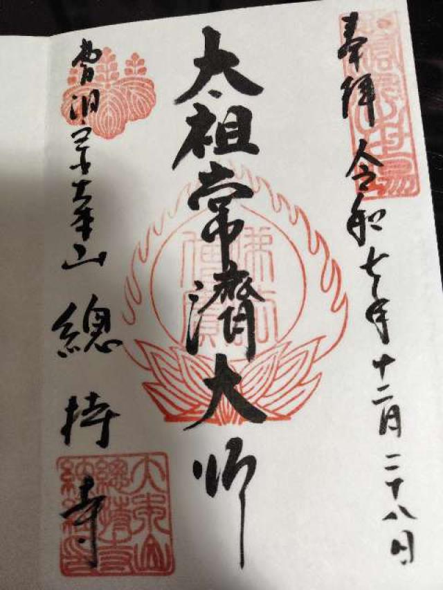 元享元年(1321)に能登国櫛比庄(現在の石川県輪島市)の真言律宗の教院「諸嶽観音堂」を住職の定賢から常済大師瑩山紹瑾が寄進され、「諸嶽山總持寺」と改号して禅院とした。 元亨2年(1322)、後醍醐天皇から「曹洞出世の道場」の綸旨を下賜され、總持寺は官寺となり、曹洞宗の大本山であることが認められた。 明治31年(1898)に火災により焼失し、明治44年(1911)に寺基を現在の地(横浜市鶴見区)に移した。 |