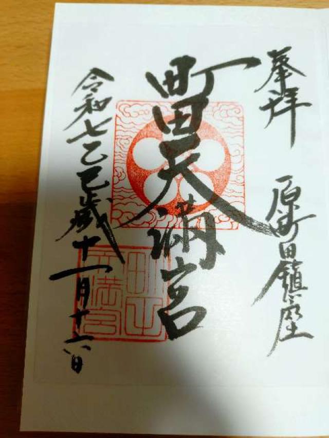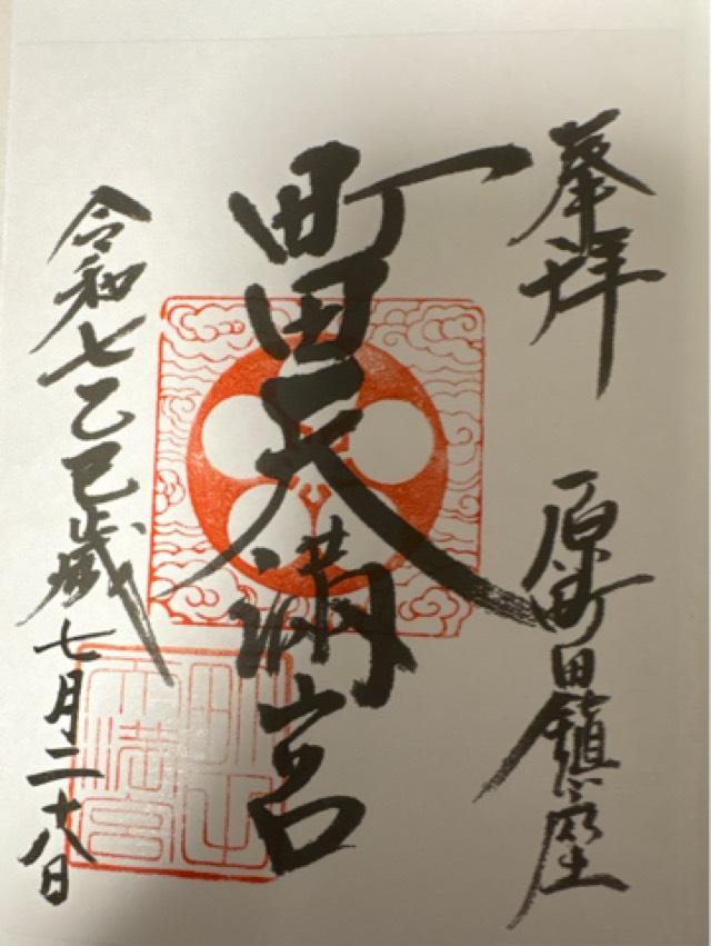 | 由来 | 町田村分村により原町田が誕生した天正十年(1582年)頃の創始と伝わる。嘉永六年(1853年)京都白川殿より、「町田天満威徳天神」の社号を賜り、御威徳益々隆昌にして今日に至る。 |