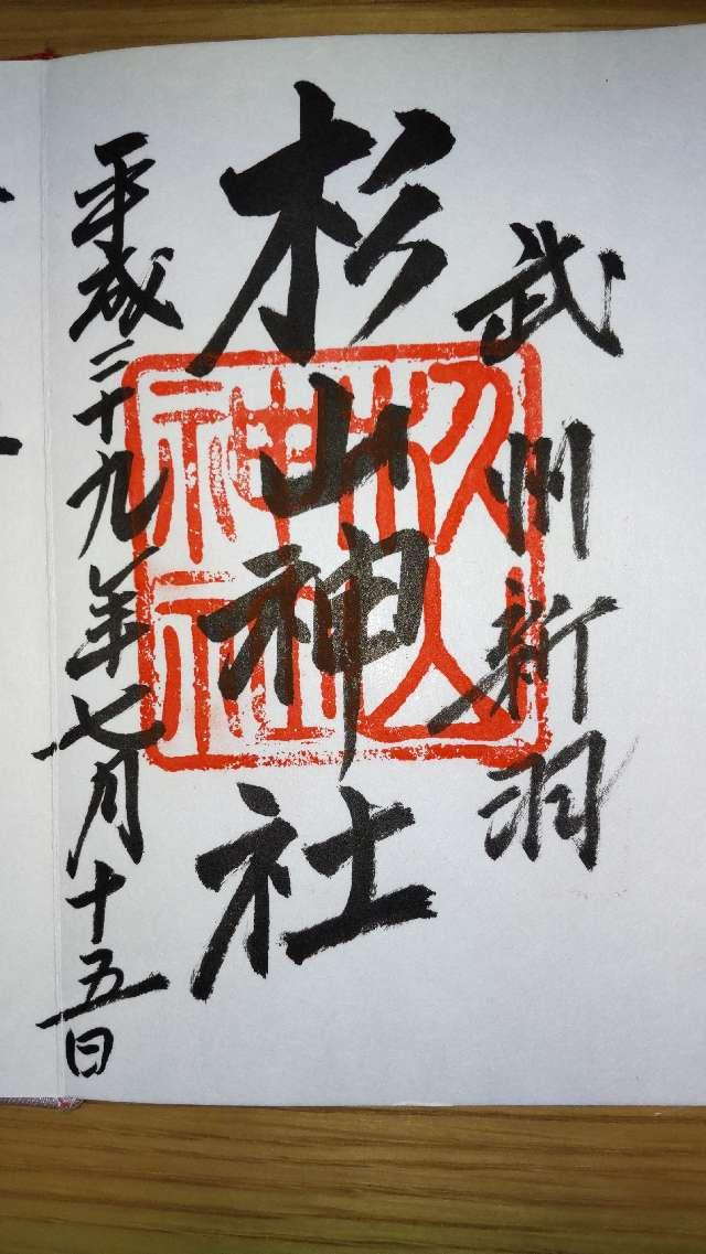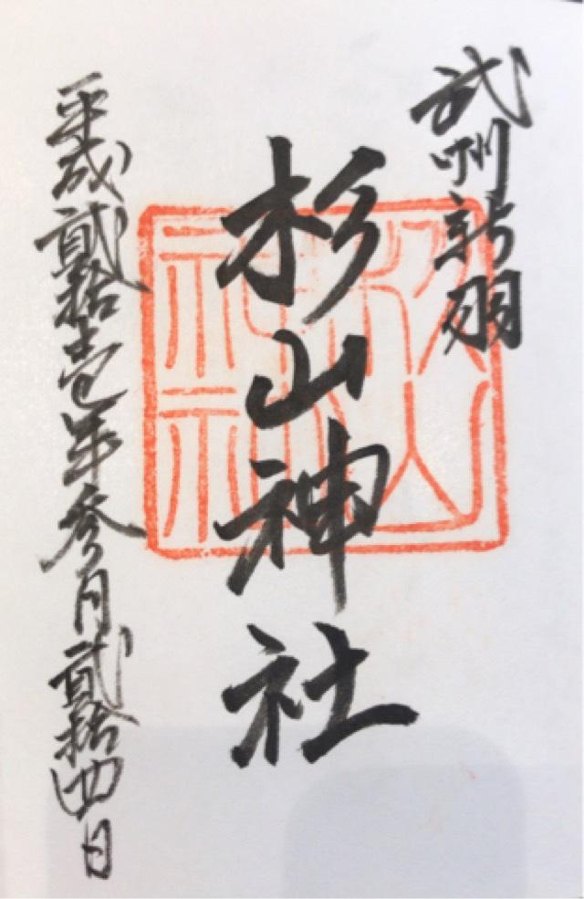 由来  杉山神社の史籍に於ける初見は、延喜式神明帳に武蔵国都筑郡、杉山神社とあり。当社の由緒は明らかでないが、口碑に伝えるに其の創立は上古根古屋の庄荷場の郷と唱う水郷一帯の時代、景行天皇の御代四十年、東方十二国御平定の折、日本武尊、此の地方を御通過され、尊崩御の後、村民其の御徳を慕い奉りて祠を造り奉斎したと云う。   明治六年、村社に列格、同四十一年、村内の無格社荒神社、熊野社、皇大神宮を合併し、大正九年、神饌幣帛料供進社に指定された。戦後宗教法人として今日に至る。