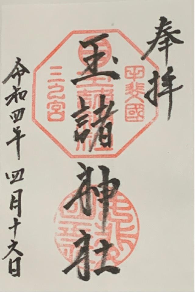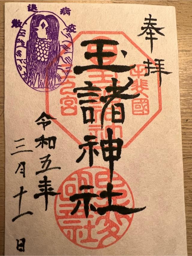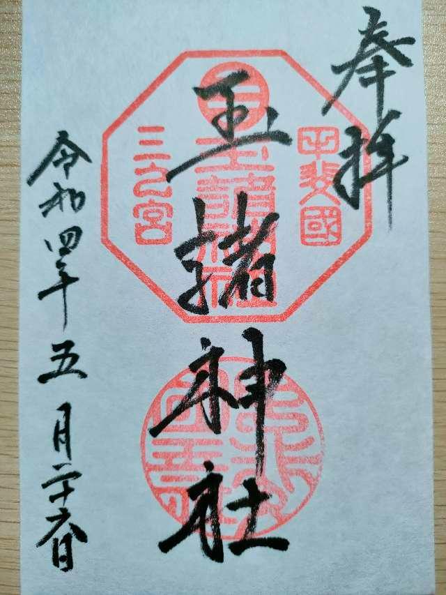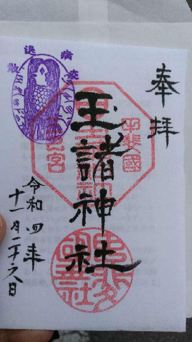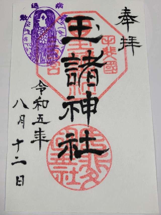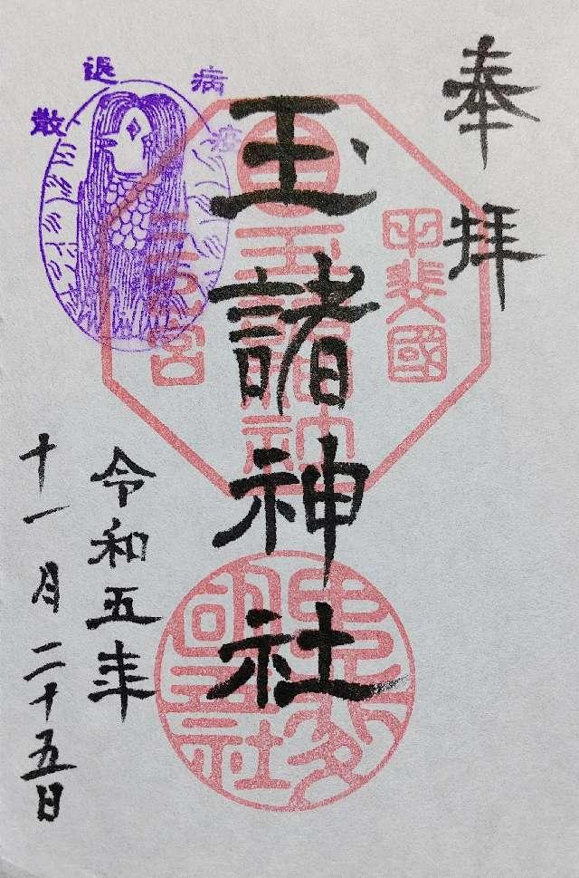 社記によると日本武尊東征の御帰路、酒折の宮に滞り国中の反乱を鎮められて、景勝の地に国玉神を祀られたに始まるといふ。又、一つの珠を埋め上に杉一株を植ゑられたが、後にこれを玉室杉と称し玉諸の名起るとも伝へてゐる。桓武天皇延暦十六年神位従五位上を賜り、淳和天皇の天長三年従三位を賜り、清和天皇の貞観五年官幣を賜り勅願所ともなって、延喜式所載の式内社に列せられた。武田氏も代々祈願所として崇敬を深めたので、天正十年には滅亡の兵火にかかり焼失したが、慶長十四年再建家康より神領拾壱石三斗余を寄進され、代々の将軍も朱印状を賜り甲州三の宮と崇敬された。又、板垣村御室山にありいつの頃かこの地に御遷座ともいふ。天長の頃より一宮、二宮、三宮と共に竜王村三社明神まで水防祭に神幸されたが、いつしかそれも絶えて久しいが平成16年より関係者の協力により復興している。大正11年12月県社に列せられる。 |