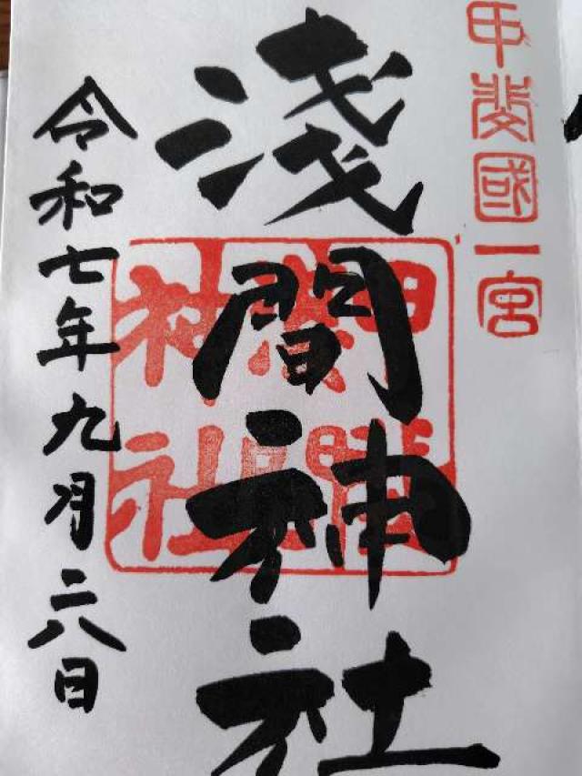 | 由来 | 垂仁天皇8年に今は摂社となっている「山宮神社」の地に創建、貞観6年(865年)富士山の大噴火により翌年現在地へ遷祀。 戦国時代は武田信玄による崇敬篤く、社領を寄進、太刀を奉納、社殿の造営を命じ、山宮神社の棟札に信玄(晴信)の名が記されている。 |