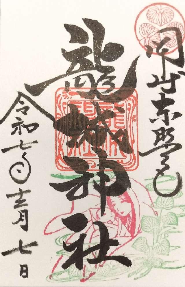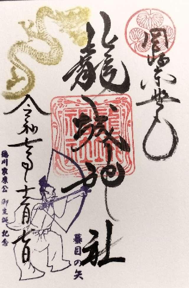| 由来 | ○往昔、三河の守護代西郷弾正ェ門稠頼が此の地に築城成る日、何処ともなく柳の五ッ衣に紅の袴をつけた気高い乙女が天守に現われ、「われはこれ歳久しく此の処に住む龍神なり、汝われを鎮守の神と崇め祀らば永く此の城を守護し繁栄不易たらしめん」と、おりしも城中の井水噴き出で、高く天に沖し飛瀑の如く龍神に注ぎ、一群の黒雲舞い下りて天守を包むと見るまに龍神の姿は忽ち消えうせた。此の不思議に城主おどろき、天守楼上に龍神を祀って城地鎮守と崇め永く加護を祈り、城の名を龍ヶ城、井の名を龍の井と称えしと云う。
