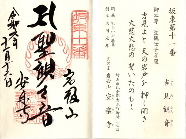 新編武蔵風土記 觀音堂 坂東十一番ノ札所ナリ坐像ニテ長一尺五寸許行基ノ作ト云或書云吉見次郞賴綱比企ノ岩殿ニ擬シテ起立セシトサレト緣起ニヨレハ源範賴平治ノ後當所ニ來リ三河守ニ任シテ吉見ノ庄ヲ領セシ頃所領ノ半ヲ寄附シ諸堂ヲ建立スト云リ又田村麻呂ノ開基ト云ハ比企郡ナル岩殿觀音ノ傳ヘヲ引付シニテ取ニ足ラストニカク慥ナルコトニハアラス 別當安樂寺 息障院ノ末岩殿山光明院ト號セリ本尊大日ヲ安ス中興開山ヲ果慶ト云開基依賴凡二百年ハカリト云 鍾樓 大同年中ノ鐘ハ天文ノ爭亂ニ破損シ元和五年再造セシニ正保三年又破損シ安永四年新ニ再造スト云 三重塔 釋迦ヲ安ス 仁王門 經堂 藥師ヲ安ス 常念佛堂 彌陀ヲ安ス 藥師堂 大日堂 岩窟ニアリ土人岩戶ト呼フ 山王社 時鐘 安永三年ノ鑄造ナリ |