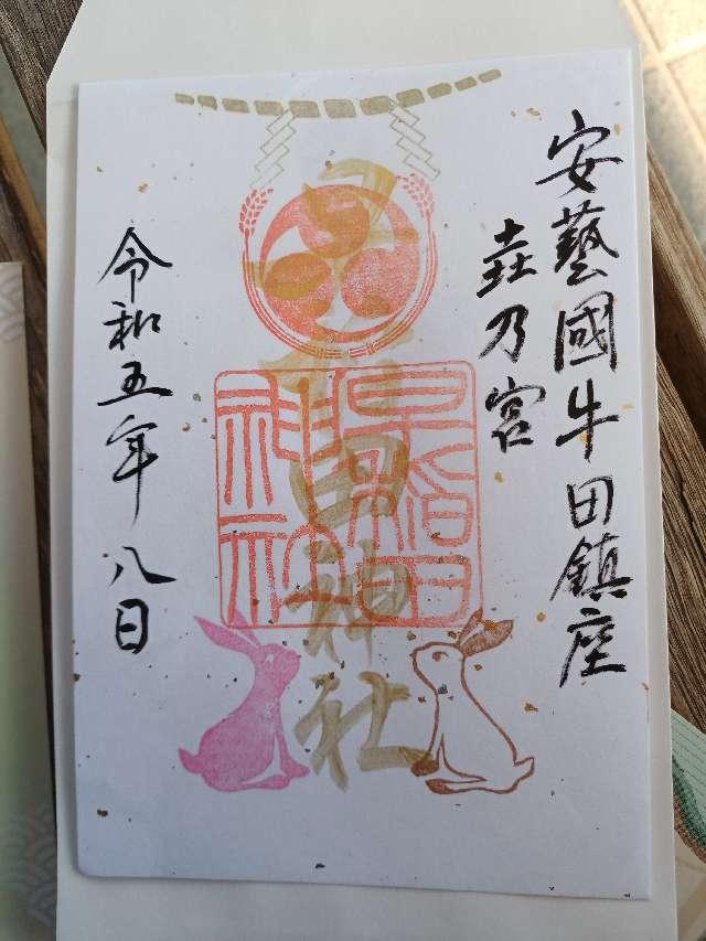 広島市牛田町鎮座 由緒 古くからの記録によりますと「文亀3年(1503)工事を起こし、爾来数年にして通常平地を一変し、一小丘を作り永正8年(1511)9月15日ここに神霊を安置せりよって今に至るもアゲハ八幡宮又はアゲの宮と称す」と書かれています。 特に武道の神として毛利氏の信仰は厚く、浅野氏の入国以来明治維新に至るまで家老が代参してお供え物を捧げ、明治42年(1909)には「神饌幣帛料の供進社」となりました。 |