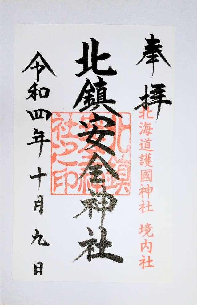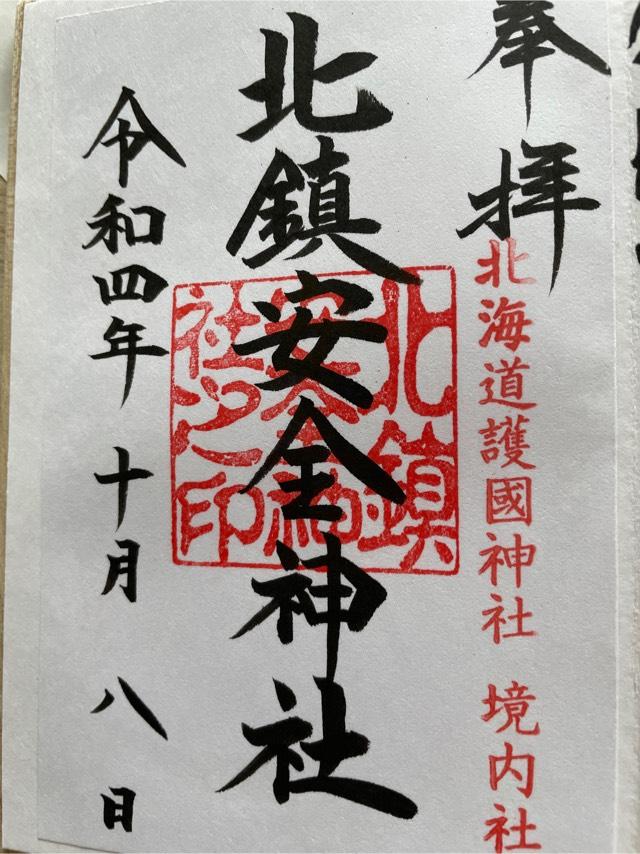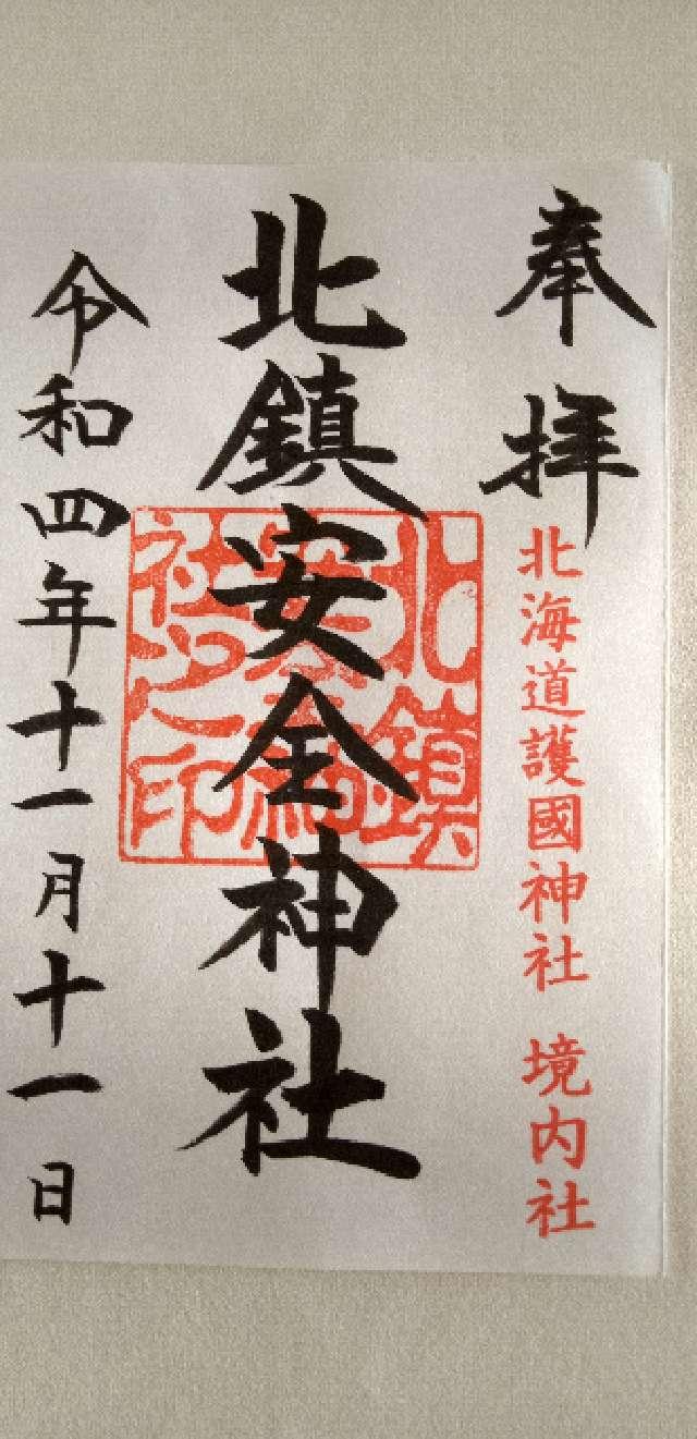 交通を主とし、諸事の安全災害防除の守護神を祀り、車を始め諸事の祈願祭を取り行っている。 昭和10年に第七師団官舎地帯の氏神として旭川市四区の偕行社前庭に遷され、御祭神には武芸の神である鹿島神宮の武甕槌大神(たけみかづちのおおかみ)と香取神宮の経津主大神(ふつぬしのおおかみ)の御分霊を拝戴し、「北鎮神社」と称する。昭和43年の開道100年記念事業の一環として当神社(現・北海道護国神社)内に奉遷され、これまでの両神のほかに車社会の現出に鑑み、交通安全・産業守護の守神として新たに3神社の安全3神の御分霊を奉戴し合祀することとなり、「北鎮安全神社」と面目を改めた。 昭和43年12月29日に創建、遷座祭が執行される。 |