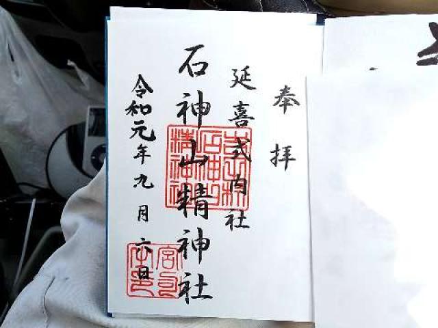 当神社の創草については詳でないが続日本記に桓武天皇の延暦9年11丁亥25日(790、奈良)に官社に進められた。又仁明天皇の嘉祥3年12月(850、平安)即位の恩典により昇叙の事あり、続日本記、続いて醍醐天皇の「延喜式神名帳」に陸奥國黒川郡四座の一に登載された。社名の示す如く社の傍に高十余丈の巨石の基に神社が祀られ古代の信仰の姿を示している。又、本殿の前には坂上田村麿将軍が蝦夷平定の奉賽に植えたと伝へる囲5米余の老杉が空をついている。江戸期岩上大明神と称されていたが明治5年1月村社に列すと、旧来の石神山精神社と名称を改めた。明治42年5月27日高田村字要害の運難神社、吉田村字山神に鎮座山神社の両社を合祀する。 |