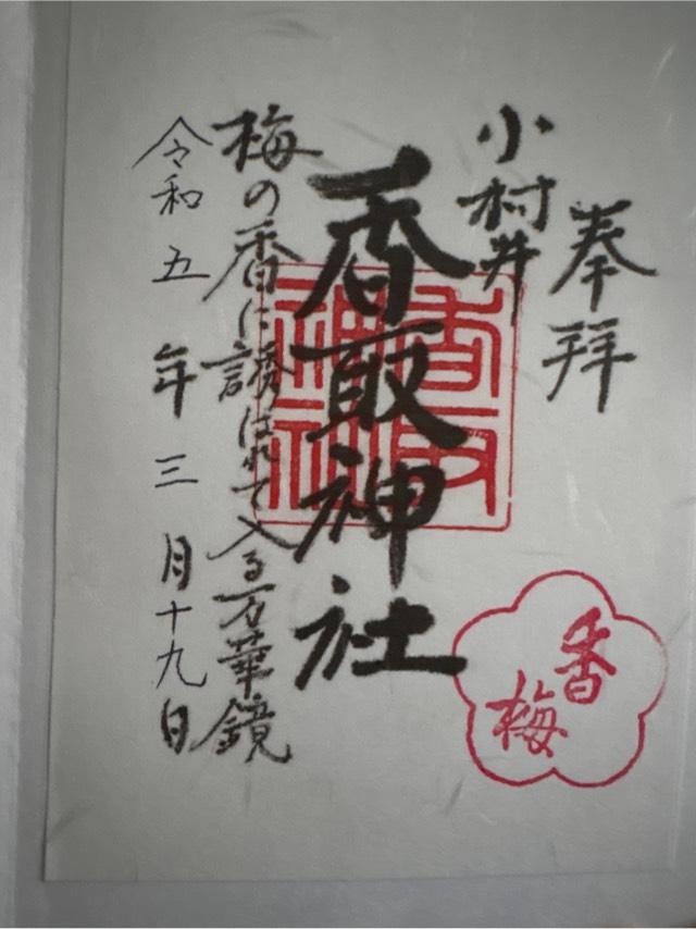 平安時代末期、當地開拓のために千葉県香取郡から六軒の人々が移住し、香取神宮の御分霊を鎮守。御神徳は、開拓・産業開発・海上守護・心願成就・縁結び・安産・勝運・交通安全・災難除け。さらに、美しい花梅の香梅園としても親しまれている。 |