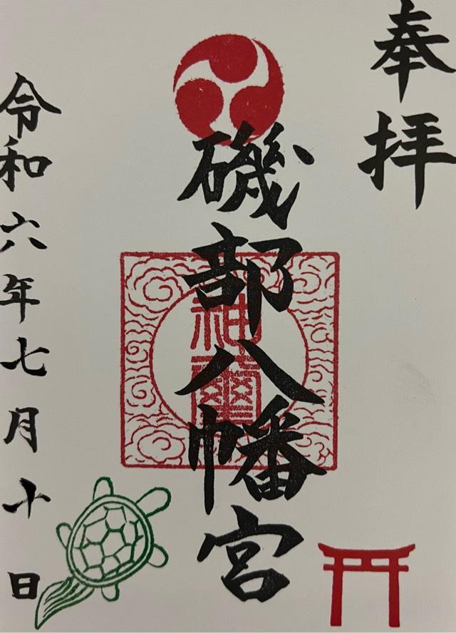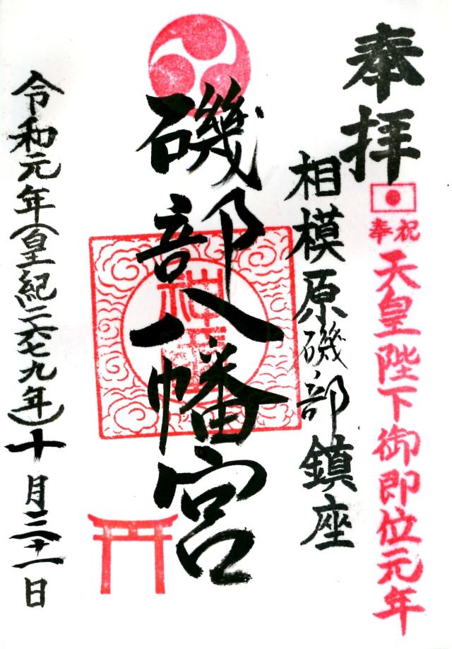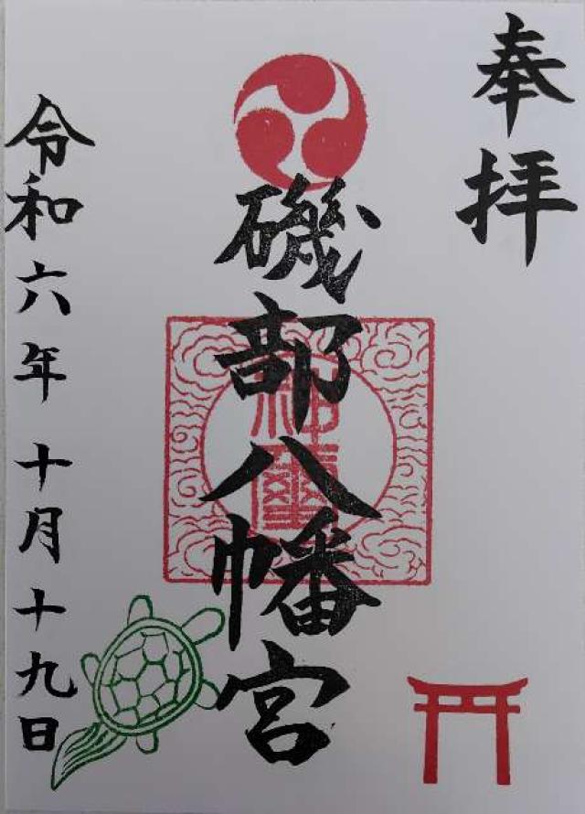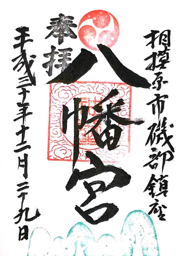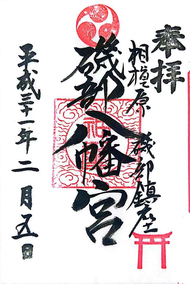| 由来 | 八幡社はもともと源氏の氏神でありますがこの社は古く創立年月日は不詳であります。延文元年(一三五六年)以前より磯部村らの鎮守として信仰厚く御神像として仏弥陀を奉斎しております。この社を開いたのは鎌倉から来訪した山伏祐圓(延文二年九月二十二日没)で別当は小田原玉瀧坊觸下の佛像院磯幡山神宮寺でありました。又文明十年三月(一四七八年)太田道灌勢により陥落するまで磯部地内には城(城主長尾景春)がありました。記録によると文禄三年(一五九四年)当時には八幡宮は幕府から社領十石を与へられておりました。享保十八年(一七三三年)七月十五日別当磯幡山神宮寺廿世仏像院快省法印参詣し毎年八月十五日に角力を興行にしておりました。当時の地頭は大津新右衛門で上下村勝坂氏子中と棟札に記されております。江戸初期の不動尊と寺社奉行宛古文書等推定樹齢五百年の銀杏が現存しております。当社では山伏の修験が行われ江戸時代には沢山の家業繁昌厄除が焚から又この地域は大山詣りの宿場のため境内は非常に賑ったと伝へられます。当時は対岸の依知、山際等からも参拝があり特に火渡りの護摩が有名でありました。明治二年神仏混淆の禁令により別当職が解かれ八幡大神と称しました。明治六年村村社に指定されました。明治二十六年の神社明細書には氏子数(上磯部、下磯部勝坂)で二二九戸と記してあります。明治四十年境外地(山林)は神社風致林として宮内省御料局より拂下げを受けました。大正十二年三月老朽に伴い氏子の奉賛により社殿を新改築いたしました。昭和十年九月二十七日新磯村の総鎮守として指定村社に列せられ法律の施行により昭和二十八年七月宗教法人となりました。昭和五十七年十月東京電力株式会社の送電線神社用地上空通過に伴う神社補償料にて、御社殿、末社、鳥居、石段、手水舎等の改築しました。