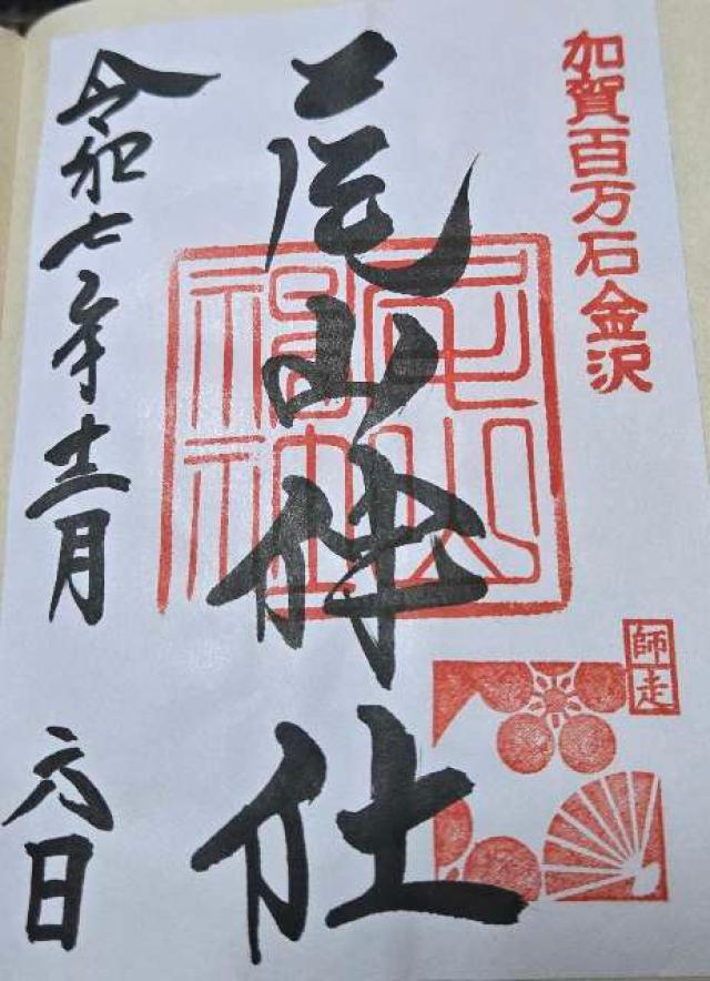 | 由来 | 前田利家公薨去後、英霊奉祀の企てありしも憚る所あり、越中国射水郡守山海老坂烏帽子峰鎮座の八幡大神を遷座すると揚言し、公の英霊を卯辰山麓に祀り卯辰八幡社と称す。明治維新後藩士及加越能三州の人士相計り明治5年出願。翌6年許可と同時に尾山神社と改称郷社に列格、同年現今の社地に遷座。翌7年県社に昇格。明治10年聖上北陸御巡幸金沢に御駐輦に際し、御幣物奉納爾後数回御幣帛下賜。明治35年別格官幣社に昇格。尚、重文神門は明治8年和漢洋混用の特殊の建築物として異彩を放つ。神苑、金沢市指定文化財。泉山築山を設け、池泉廻遊の様式にて、楽器に型どり、写実的表現の妙をつくしている。重文、朱塗雲龍文蒔絵大小、桃山時代の作風を示している。 |