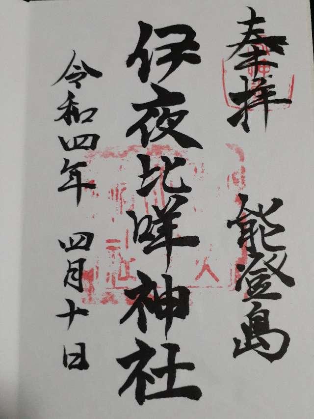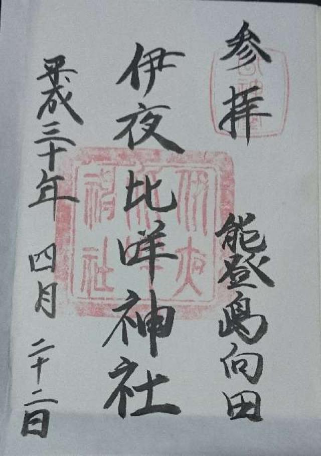 本社は創立の年代を明記できないが、延喜式内社である。古く、旧社地イヤミより現在の地、八幡山へ遷り、八幡神社と合祀する。神明神社は能登島御厨の神社であるが合祀し、白山神社は明和6年に、菅原神社は寛政12年に勧請し合祀す。往古より産土神として篤く崇敬される。向田(能登島)の火祭が奉納される。 |