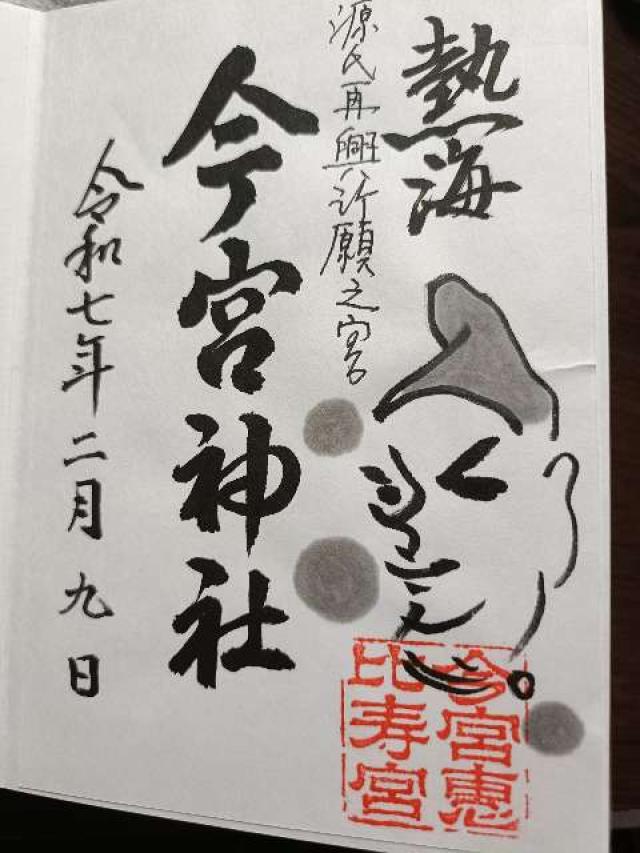 今宮神社縁起 源頼朝公伊豆に流寓の砌、伊東祐親の為、伊東より伊豆山に難をのがれんとして、多賀山を越える際、頻りに渇を覚え歩むことを得ず。 然るに、経側に一軽井を得て之に渇を癒した。 これが所謂頼朝の一杯水である。 然して其の麓に大楠木ありて神祠あり、之に額づき成功開運を祈願す。 即ち今宮神社である。 頼朝はそれより、厚く当社を崇敬し社殿を造営す。 寛文12(1672)年5月 源直輝敬白 【社頭板碑】今宮神社誌 祭神 事代主神 大国主神 例祭 10月20日 当社の創祀は1千数百年前と云はれ 事代主神と恵比寿大国主神は大黒と称え福寿神として信仰せらる 源頼朝公源氏再興を祈請し小田原城主や伊豆代官も社殿修築の資を寄進した 大正7(1918)年2月皇太子殿下御参詣幣帛を供せられ榊をお手植遊ばされた社伝獅子神楽は文化財とし又森は天然記念物として指定され保護さる 和田地区二十町総氏神なり |